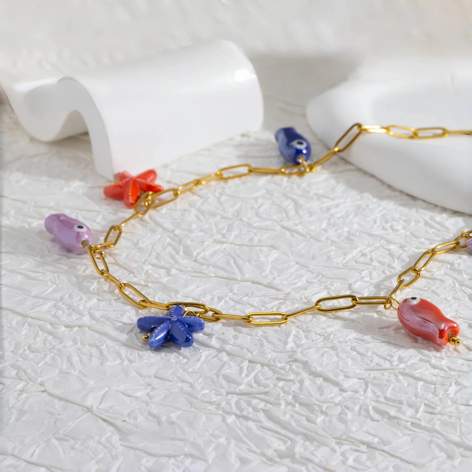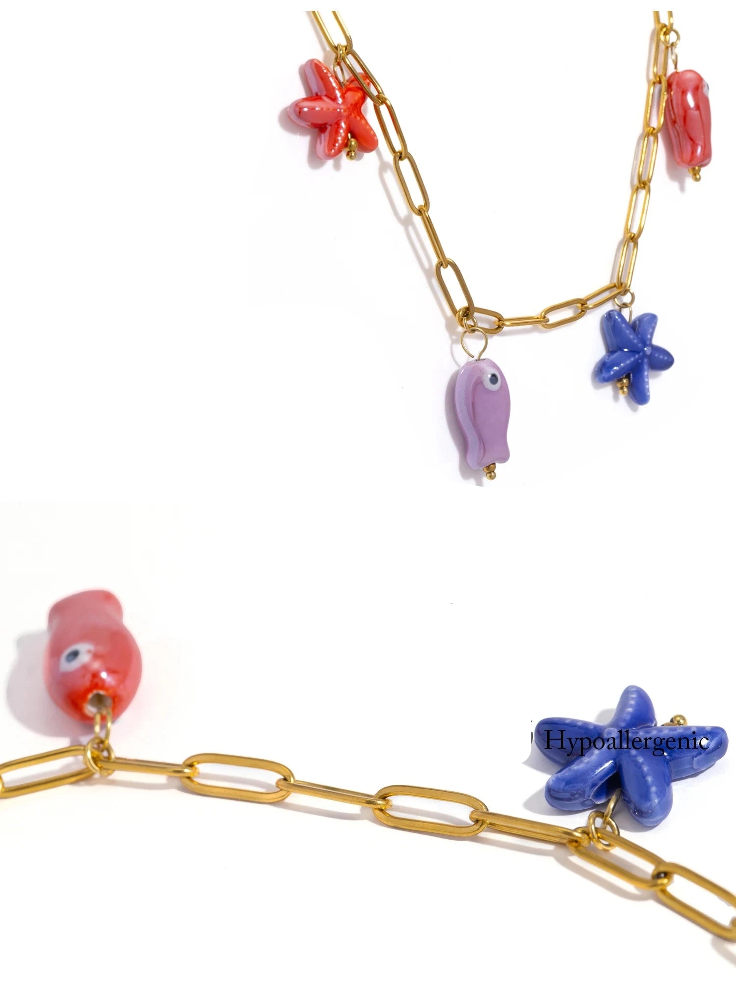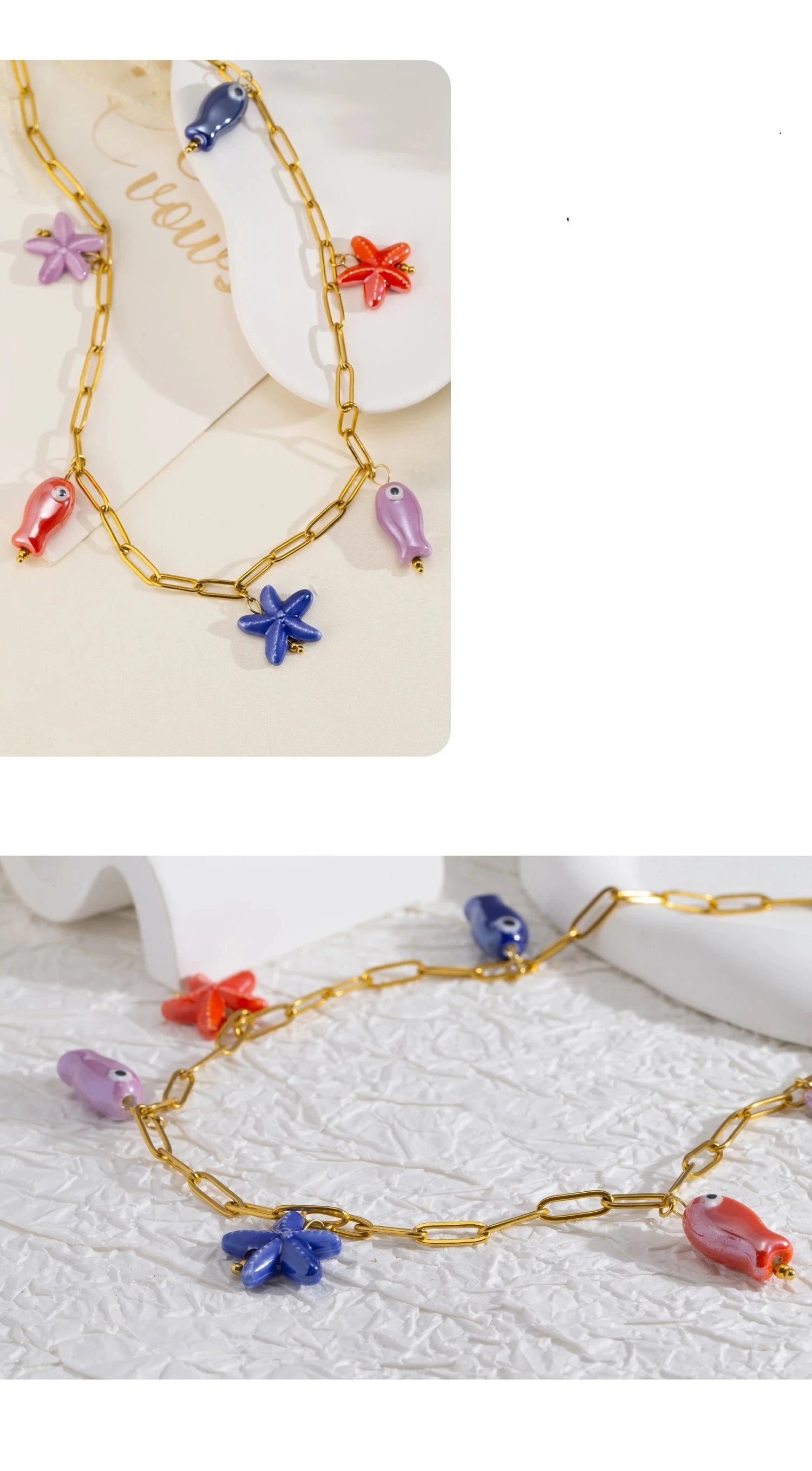 Das Ocean Spirit Necklace vereint die spielerische Seite des Meeres mit hochwertiger Handwerkskunst. Der farbenfrohe Fisch und der zarte Seestern, kombiniert mit edlen Keramik-Details, stehen für Lebendigkeit, Freiheit und die ungezähmte Energie des Ozeans.