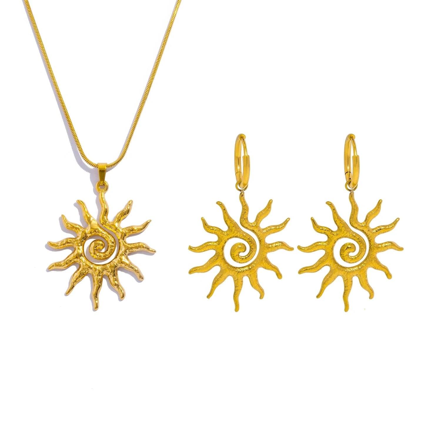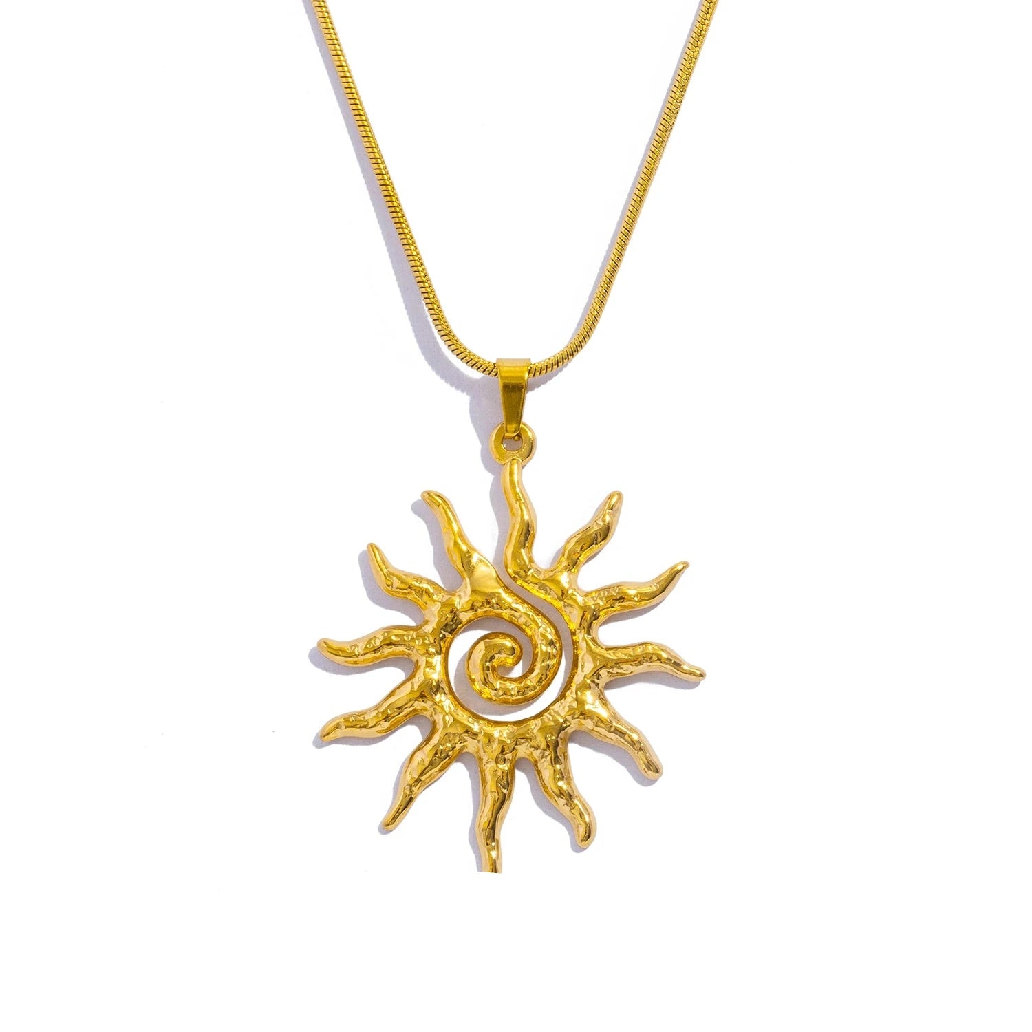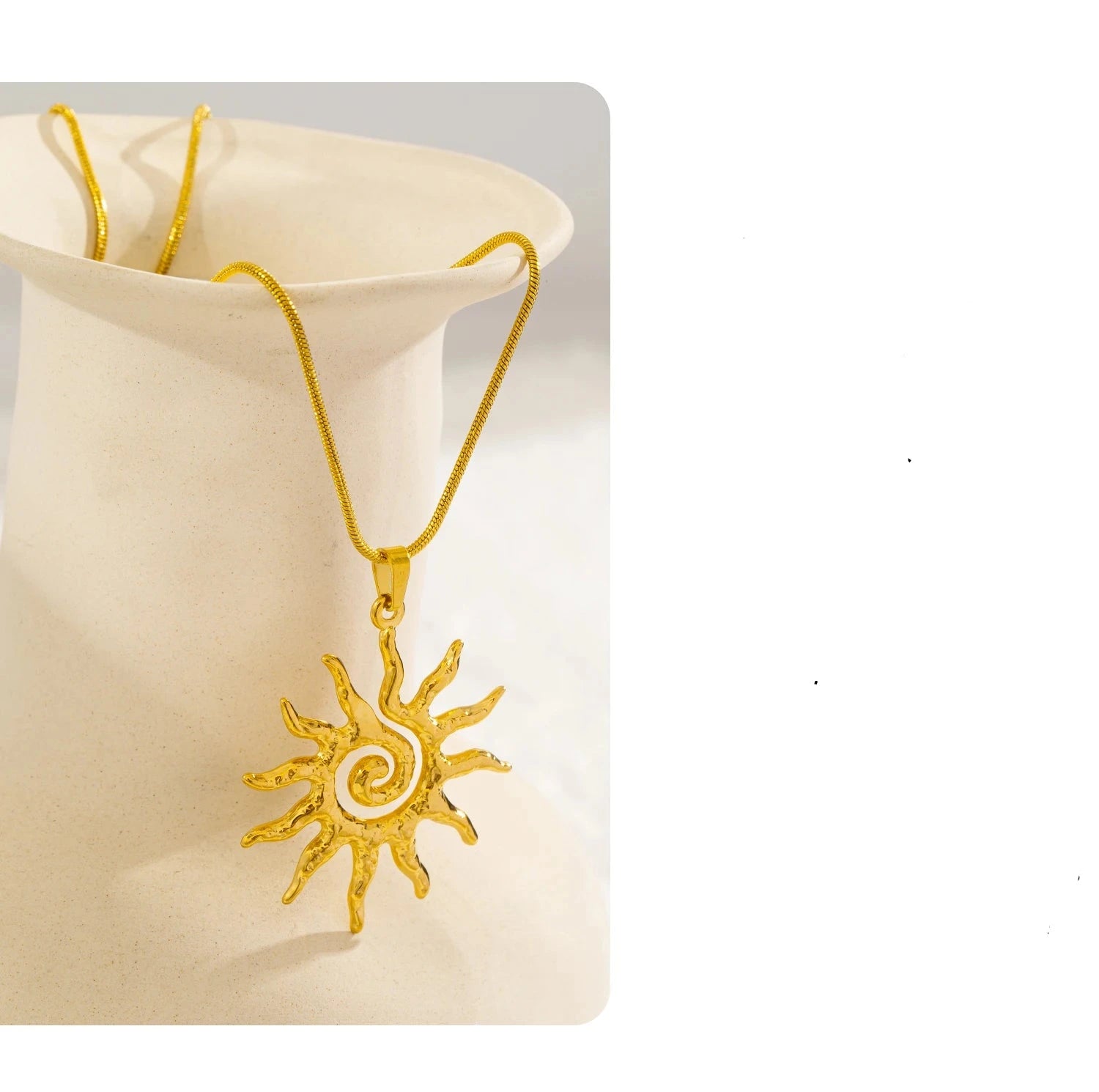 Das Solaris Necklace verkörpert die unendliche Energie der Sonne. Der Spiral-Anhänger strahlt Stärke, Wärme und Freiheit aus – ein Symbol für Leichtigkeit und Lebensfreude, eingefangen in edlem 18K-Goldglanz.