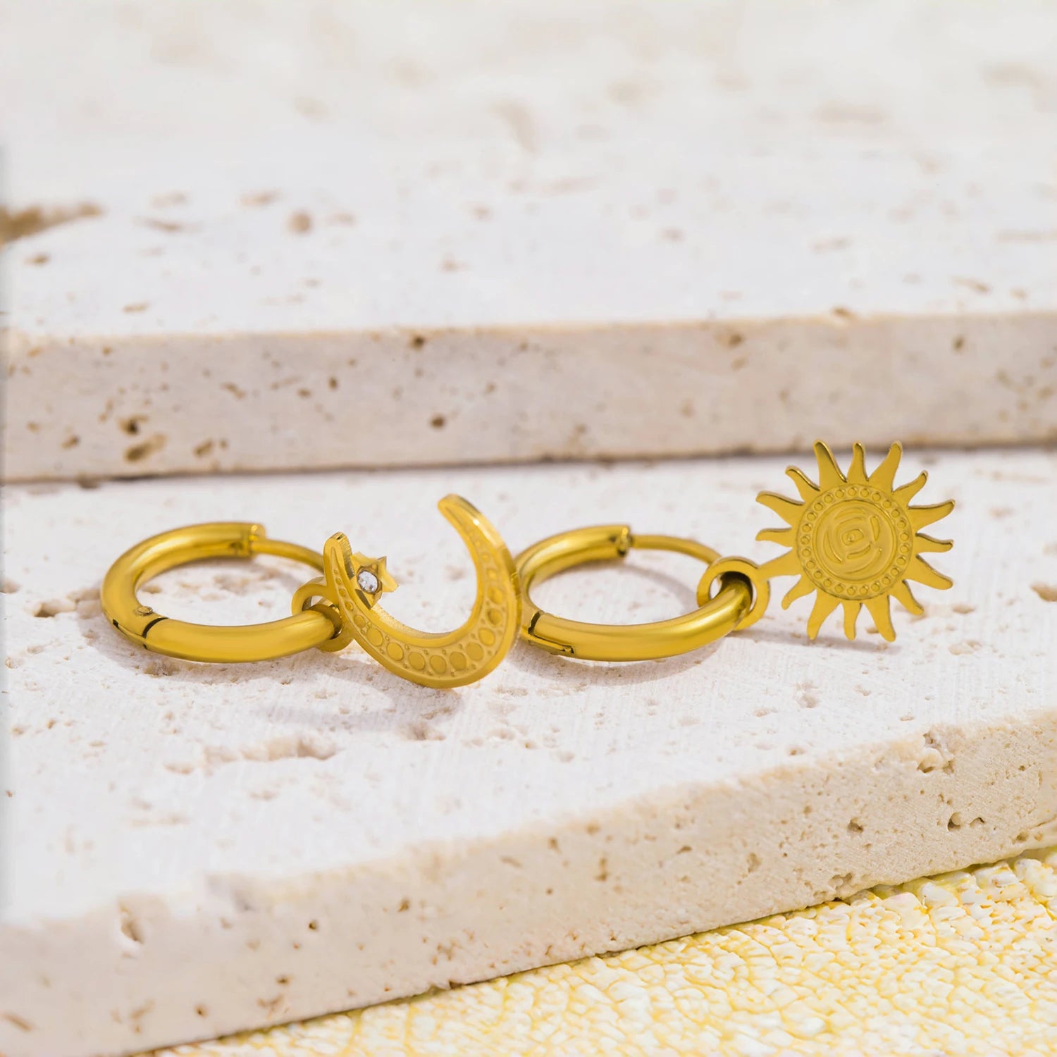 Die „Celeste Earrings“ vereinen die Kraft der Sonne und die Ruhe des Mondes in einem außergewöhnlichen asymmetrischen Design. Funkelnde Zirkonia-Steine bringen kosmischen Glanz in jedes Outfit – ein Schmuckstück, das Balance, Energie und Eleganz symbolisiert.