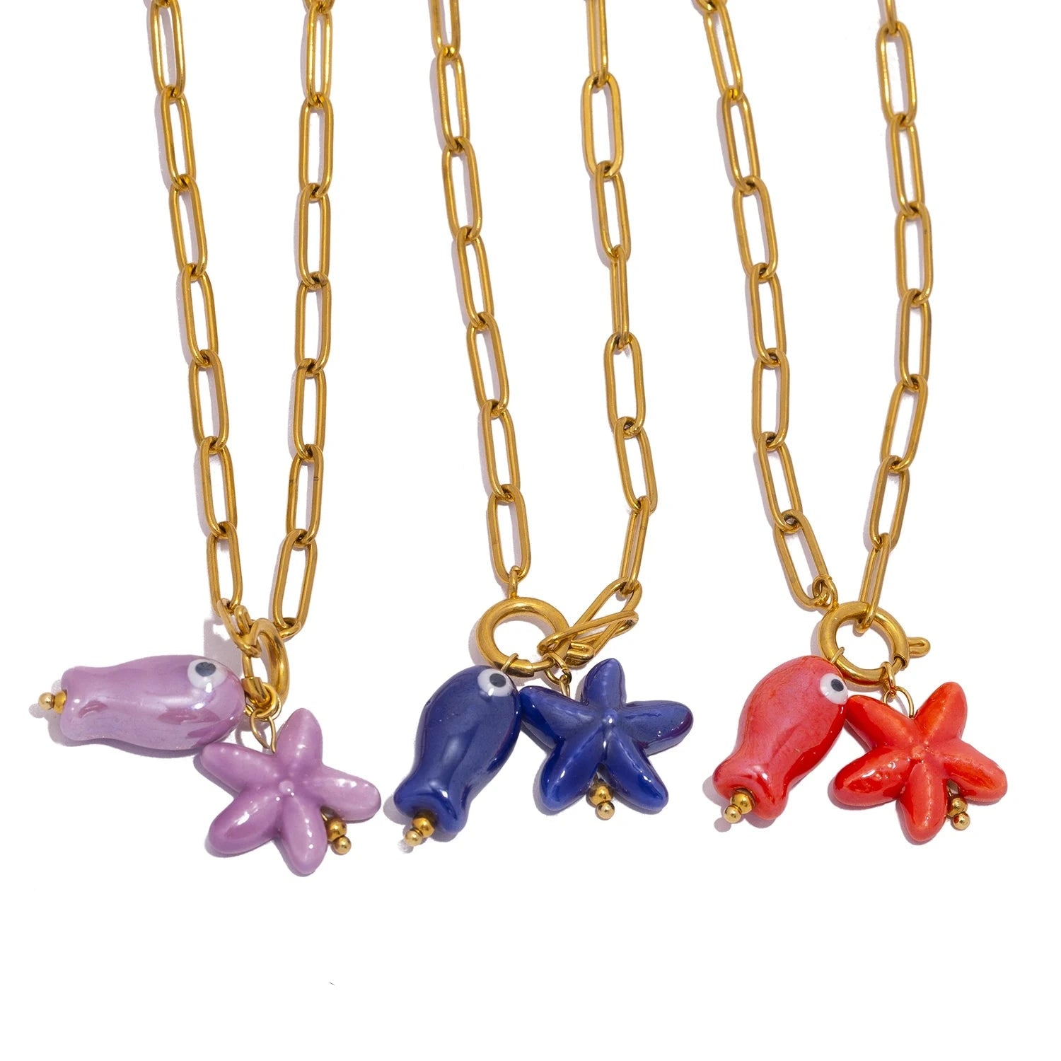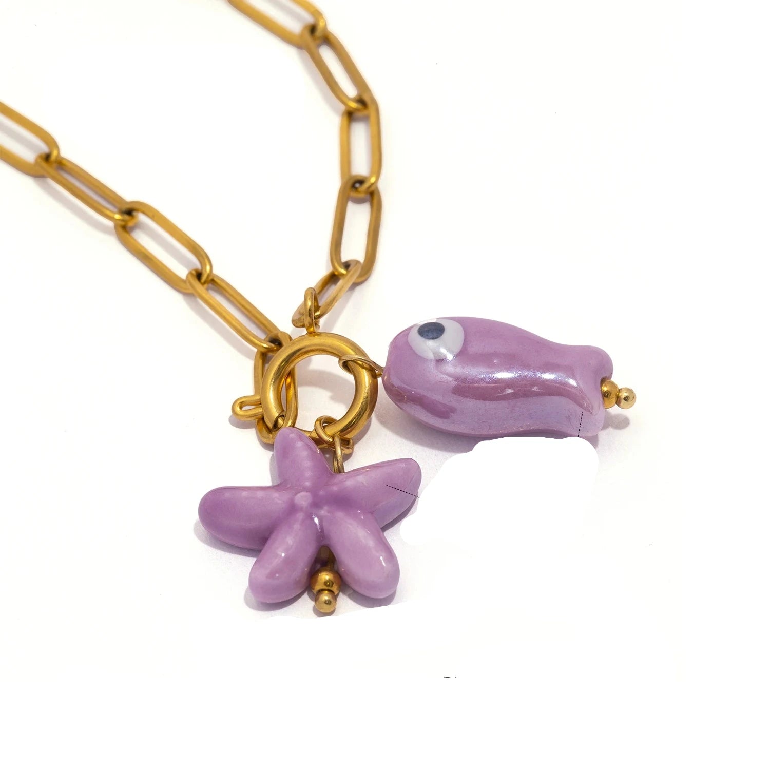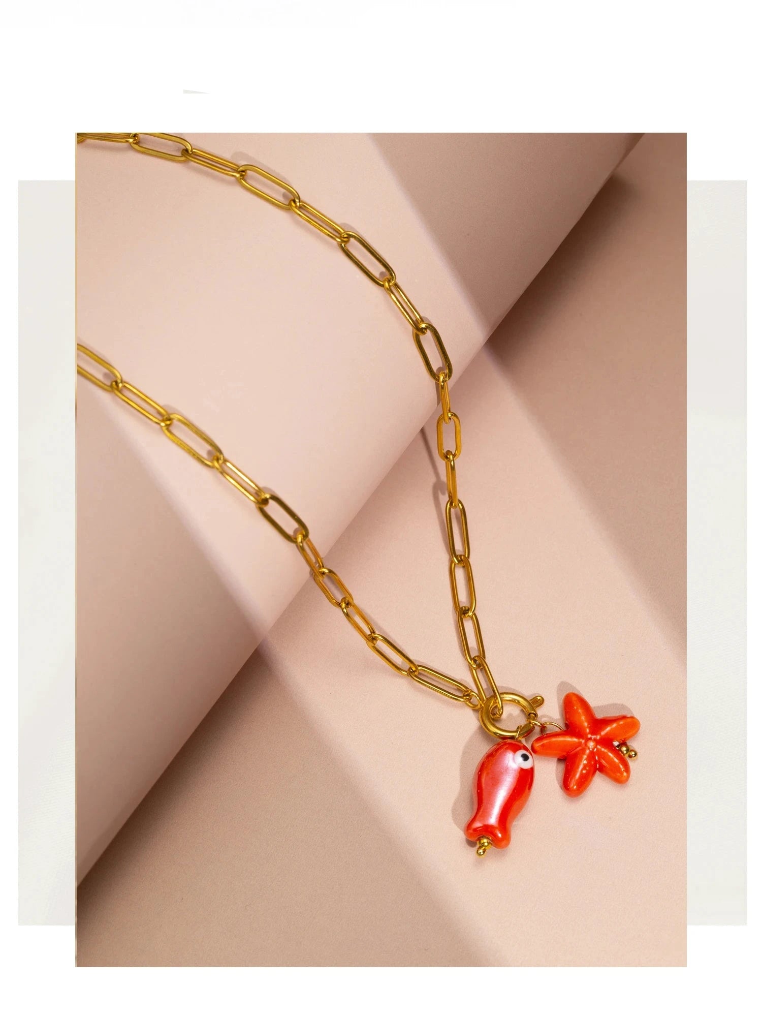 Zarte Anhänger in Form von Fisch und Seestern symbolisieren Freiheit, Lebensfreude und die Schönheit des Ozeans – perfekt für alle, die das Meer im Herzen tragen.