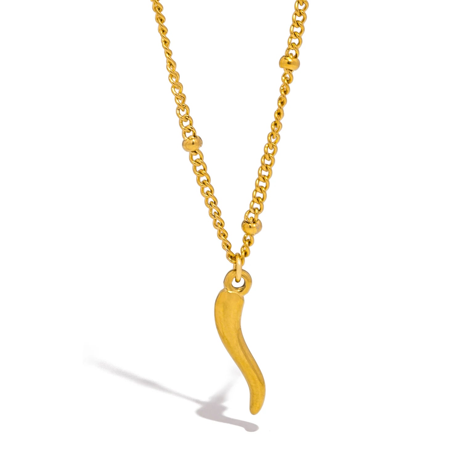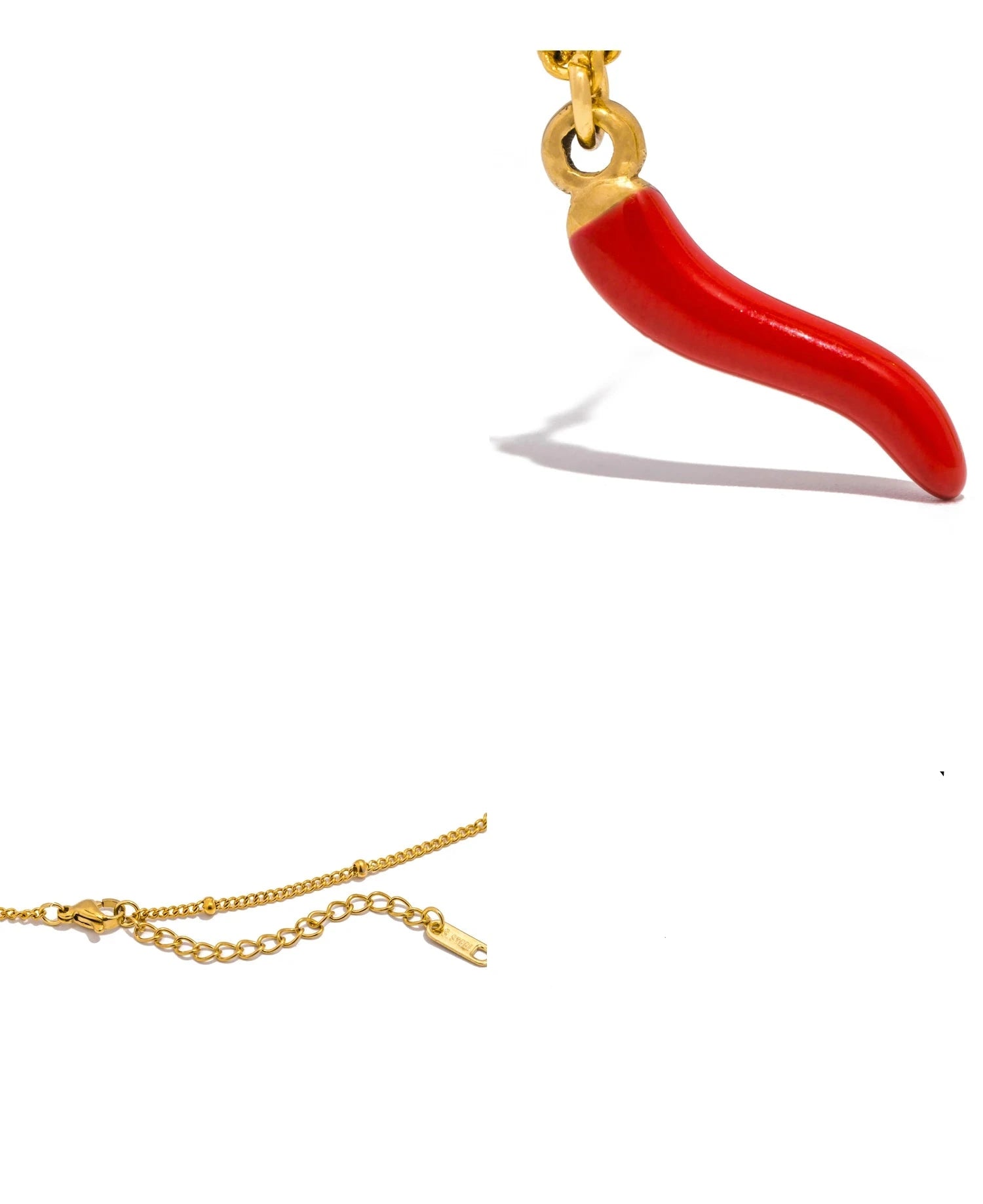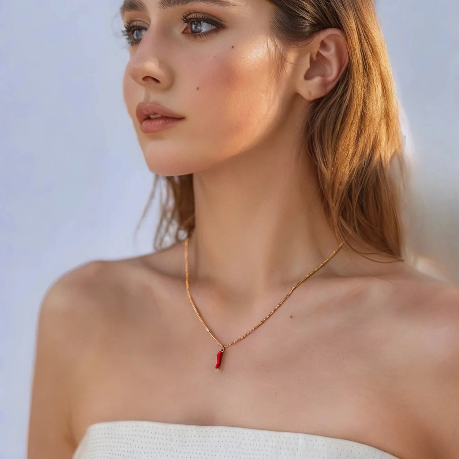 Das Tropical Flame Necklace ist ein Statement für alle, die ihr Feuer zeigen wollen. Der leuchtend rote Chili-Anhänger steht für Leidenschaft, Energie und Lebensfreude – kombiniert mit einer zarten Bead-Chain in luxuriöser 18K-Vergoldung.